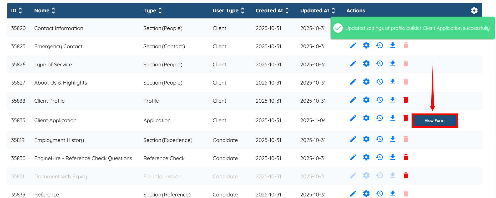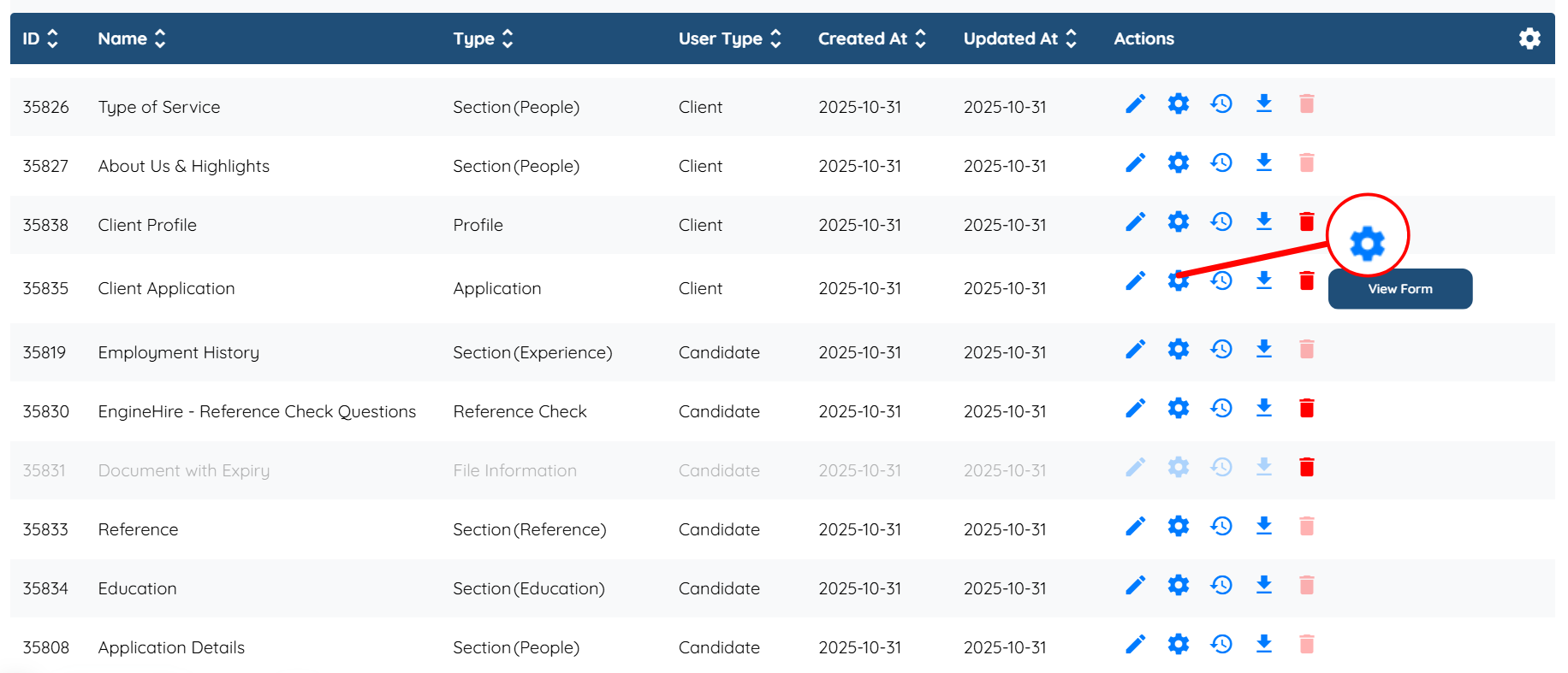 Step 2: Locate the application form where you wish to enable the captcha, and then click the Gear icon associated with that form in the Actions column.