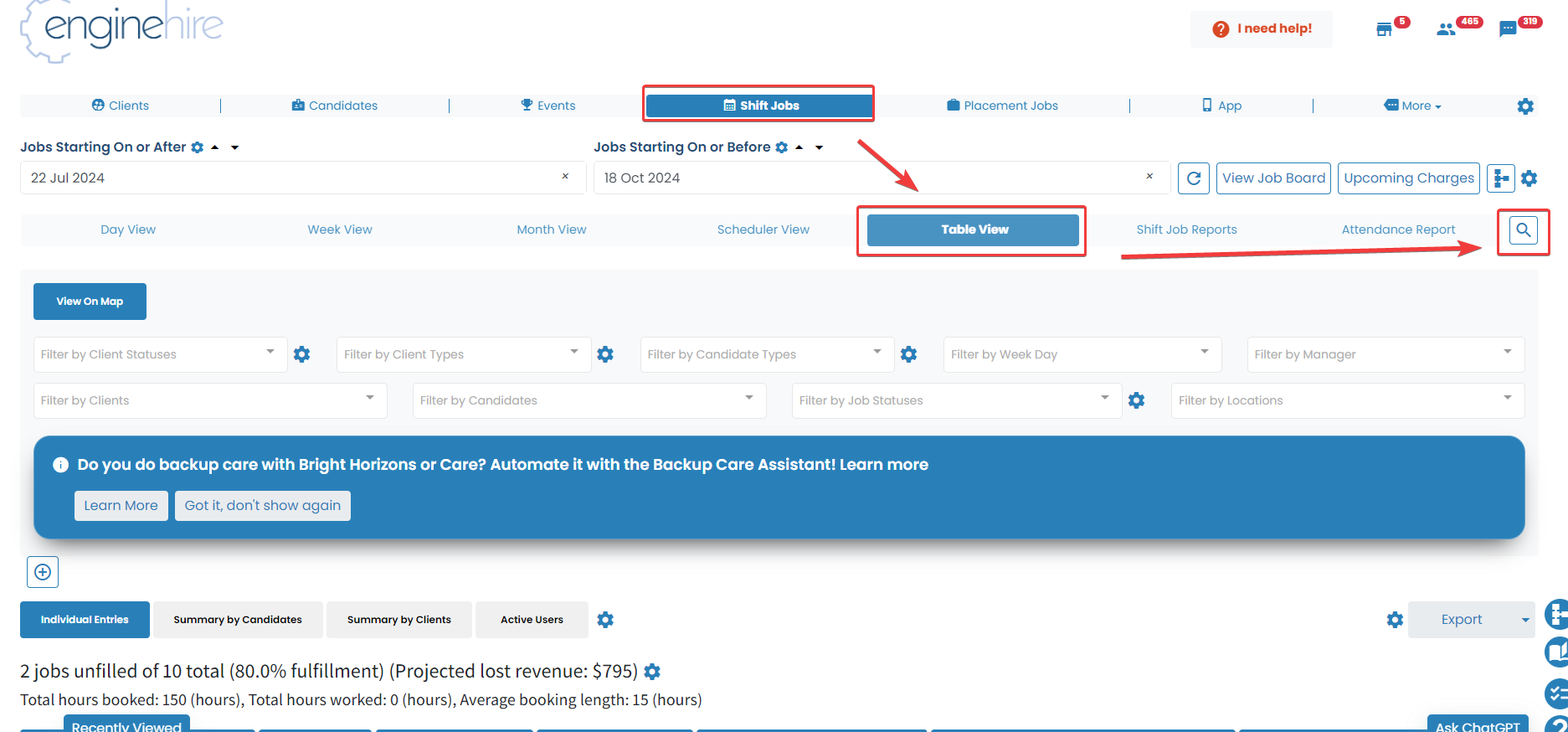 On a shift job calendar, select Table View then click on the search icon to reveal the filters.